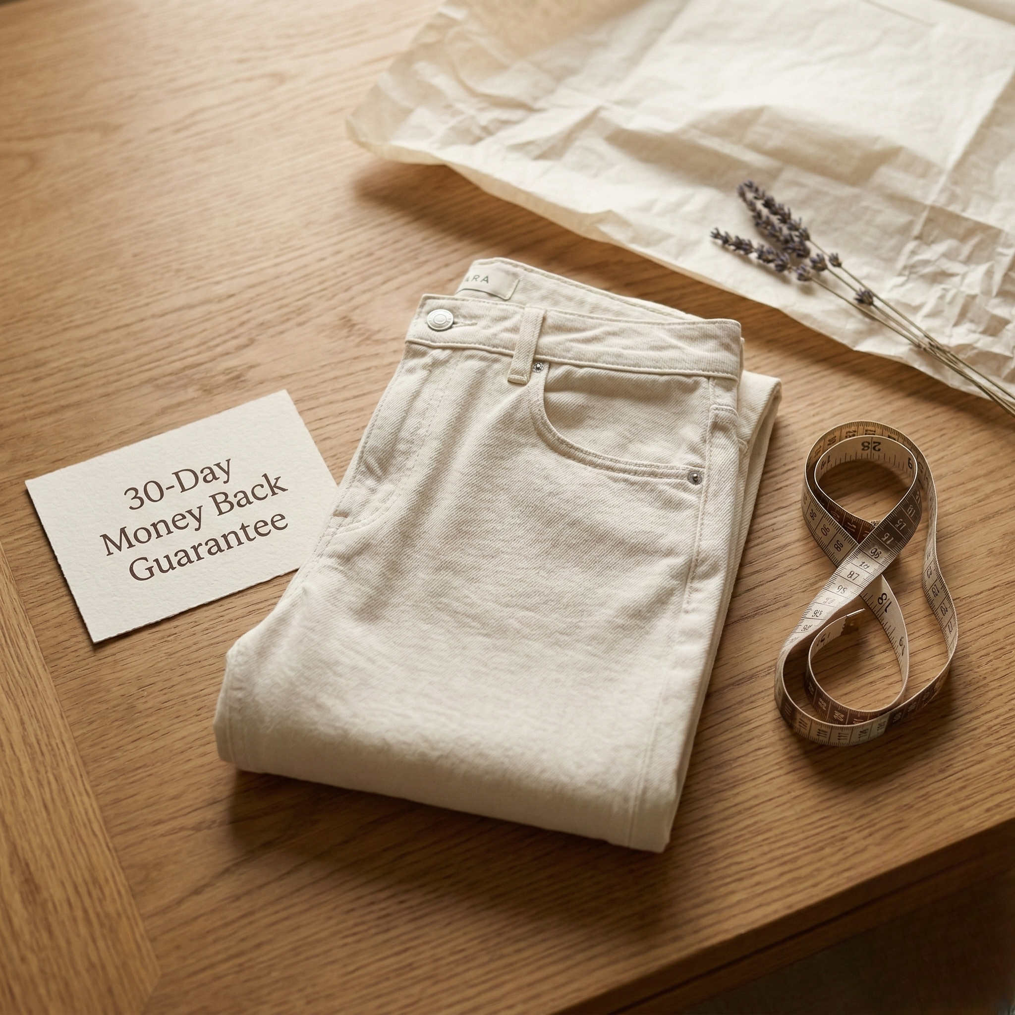 Every product page has real garment measurements in centimetres — not just S, M, L. We tell you the waist, hip, inseam, and leg opening so you can compare against something you already own and love. If we think a product runs small or large, we say so. No guessing.
